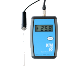 De DTM65 is de economisch geprijsde uitvoering van de serie DTM-handthermometers. Deze meter is geproduceerd in een robuuste uitvoering met moderne elektronische bouwstenen, zodat er dan ook standaard 5 jaar fabrieksgarantie op wordt gegeven! Met een standaard 9Volt batterij zijn meer dan 10.000 metingen mogelijk. Na enkele minuten schakelt de meter automatisch uit om de batterij te sparen. De DTM65 kan optioneel inclusief een herleidbaar kalibratie-certificaat worden geleverd. Voor een hogere meetnauwkeurigheid verwijzen we naar de DTM55 of DTM75.